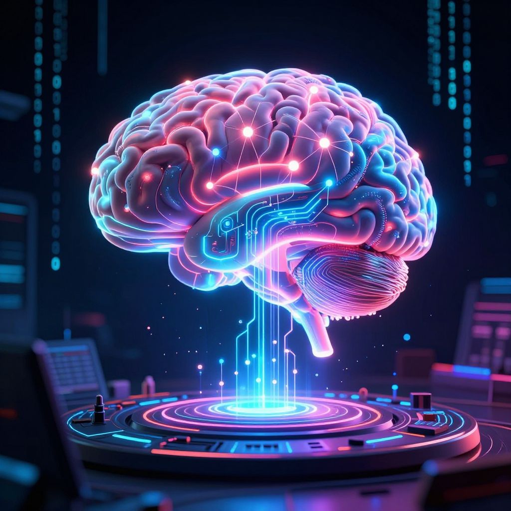 AI online generator interface glowing with futuristic neon lights, digital AI brain composed of circuit paths, sleek transparent panels displaying real-time data streams, cybernetic aesthetic, vibrant blue and purple hues, high-tech visualization, ultra-detailed