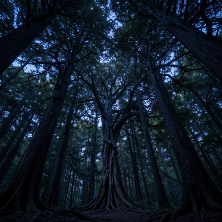 In a twilight forest where gravity defies convention, ancient trees stand inverted, their roots reaching skyward like silent prayers to the cosmos, while their weightless canopies cradle the stars, evoking a surreal sense of wonder and existential mystery.
