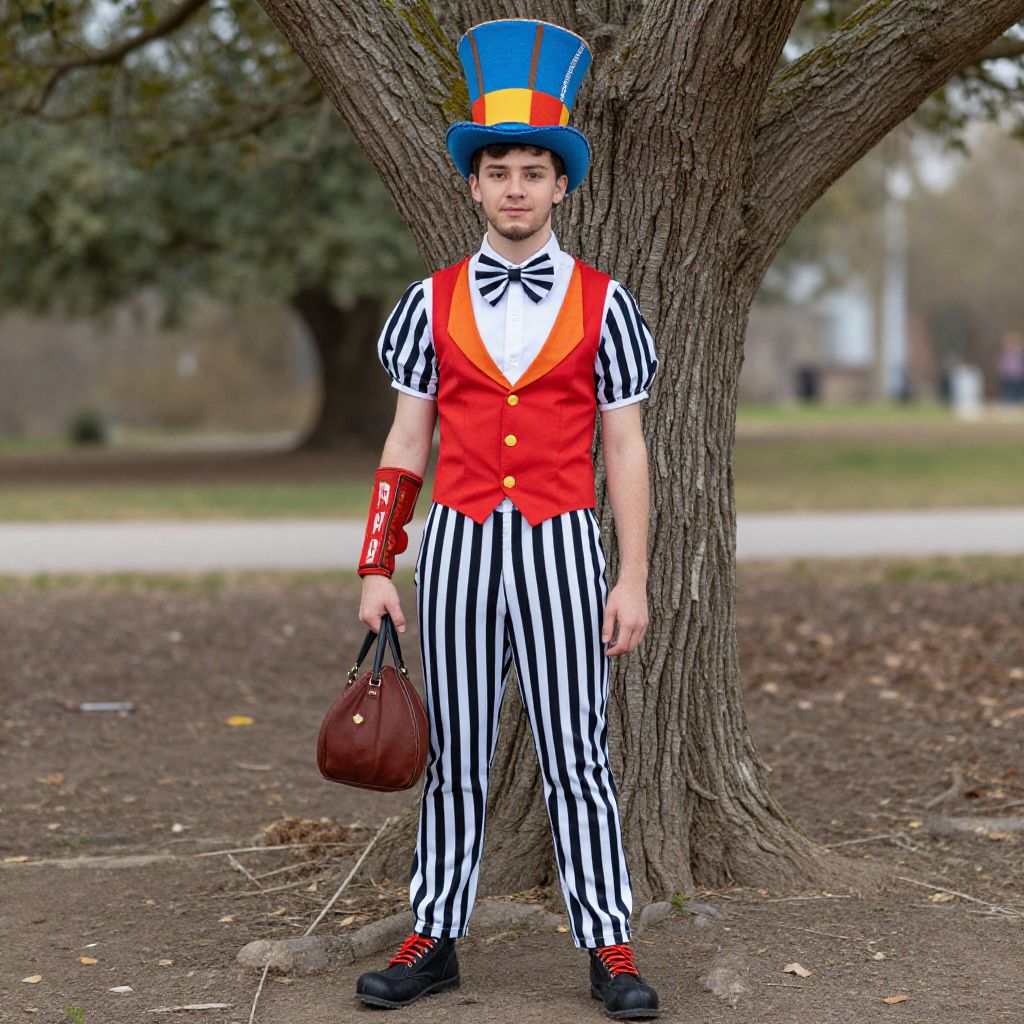 Mad hatter teen costume, 1boy, hat, male focus, top hat, solo, striped pants, tree, outdoors, pants, bow, looking at viewer, striped clothes, bowtie, vest, full body, vertical-striped pants, holding bag, arm behind back, blurry, red pants, bag, standing, facial hair