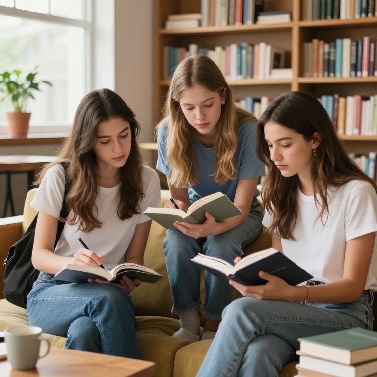 Skinny college girls studying together in a cozy modern library, surrounded by books and natural light, casual trendy outfits, relaxed and focused expressions, warm tones, detailed background with university decor, vibrant yet soft atmosphere