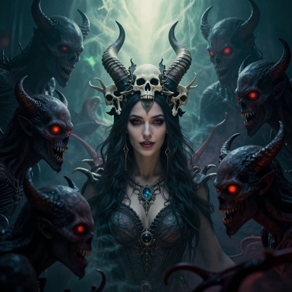 The image depicts a woman surrounded by demonic entities, creating a dreamy and otherworldly atmosphere. She is adorned with a crown of horns and a headdress that resembles a crown of skulls, adding to the eerie ambiance. The woman's expression is serene yet intense, with a slight smile that contrasts with the menacing presence of the demons. The demons, with their glowing red eyes and sharp teeth, are positioned symmetrically around her, their forms blending into the dark, smoky background. The overall color palette is dominated by dark blues and greens, with hints of red and white, enhancing the surreal and mystical feel of the scene. The composition is balanced, with the woman at the center, the demons encircling her, and the ethereal light above her head creating a sense of depth and dimension. The interplay of light and shadow, along with the intricate details of the demons' features, adds to the complexity and richness of the image.