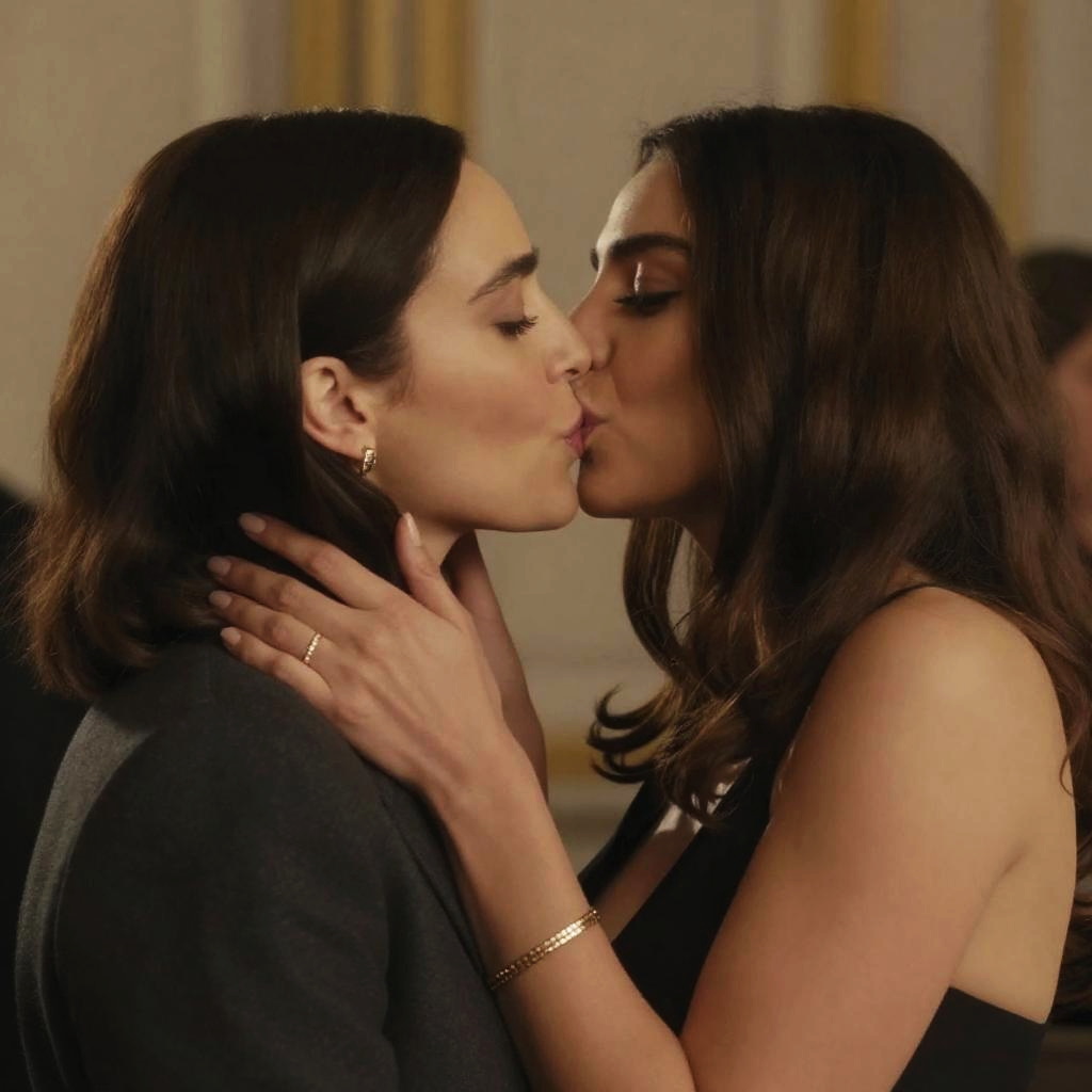 Monica Bellucci kiss tender moment, cinematic lighting, soft focus, romantic atmosphere, elegant evening attire, warm colors, detailed facial expression, ultra-realistic style
