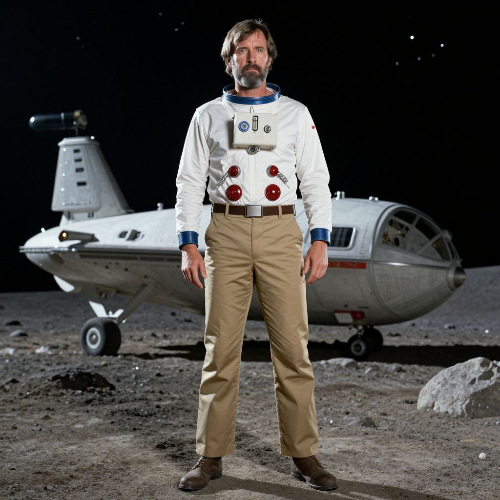 A tall man in his 50s with a beard and kind eyes wearing khaki pants as part of a 1970s astronaut costume, standing on a rocky moon-like surface, with a retro-looking spaceship in the background and a starry night sky