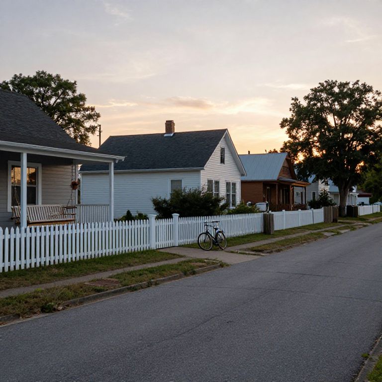 A quiet rural street at sunset, with a few houses with white picket fences, a porch swing swaying gently, and a lone bicycle leaning against a wooden fence, depicting the peaceful nature of everyday life rural communities