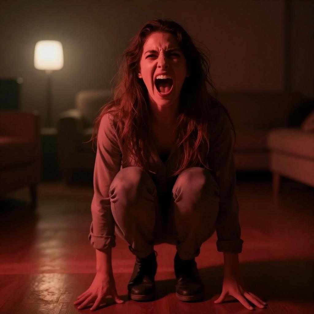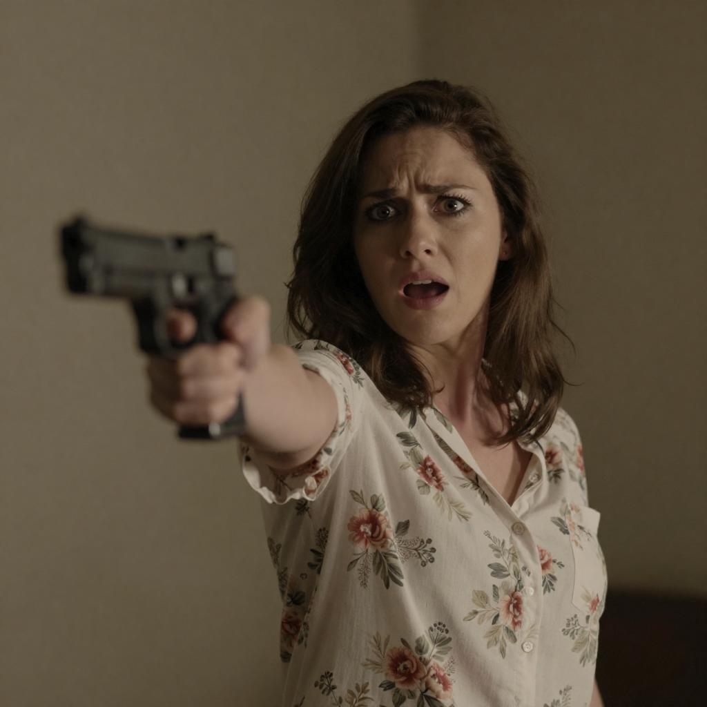 A photograph of a frightened woman with shoulder-length brown hair, wearing a white floral shirt, pointing a handgun directly at the camera. She has an open-mouthed, terrified expression. The background is a dimly lit, plain room with a beige wall. The gun's barrel is illuminated, contrasting with the darker surroundings.