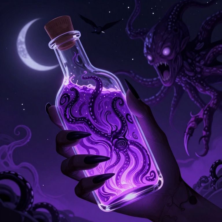 In this vivid and surreal illustration, a hand with sharp, pointed nails holds a bottle filled with a mesmerizing, glowing liquid. The bottle, glowing with a mesmerizing purple hue, is adorned with intricate tentacle-like patterns that seem to writhe and twist within its confines. The hand, with its dark, almost shadowy appearance, contrasts sharply against the vibrant colors of the bottle and the surrounding environment. The background is a dark, starry night sky, punctuated by a crescent moon and a solitary bird in flight. The scene is further enhanced by the presence of a menacing, tentacle-wielding creature with glowing eyes and an open mouth, emerging from the bottle and reaching out towards the viewer. The overall composition is dynamic, with the hand and bottle acting as the focal point, while the creature and the dark, starry background create a sense of depth and tension. The interplay of purple and dark tones, combined with the intricate patterns and textures, creates a visually striking and otherworldly scene.