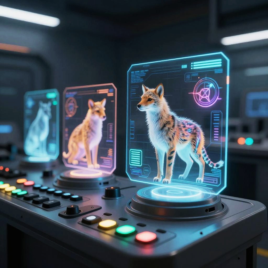 Close-up of an animal AI generator control panel, holographic animal projections emerging, sleek buttons and LED lights, sci-fi lab with dark background, intricate mechanical parts, vibrant neon glow, concept of artificial intelligence in wildlife simulation