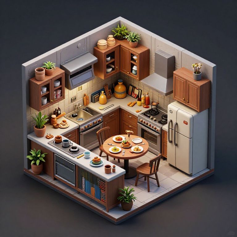 Isometric digital illustration of a small, cozy kitchen with wooden cabinets, white appliances, round table, two chairs, potted plants, and breakfast dishes