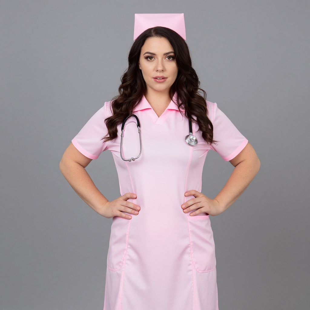 Photograph of a woman standing against a plain gray background. She has long, wavy black hair and fair skin. She wears a pink nurse's uniform with a short-sleeved top and a matching skirt, featuring a white collar and buttoned front. A pink nurse's cap sits atop her head. A stethoscope hangs around her neck. Her hands rest confidently on her hips, and she gazes directly at the camera with a neutral expression. The image is brightly lit, highlighting the crispness of her uniform and the smooth texture of her skin.