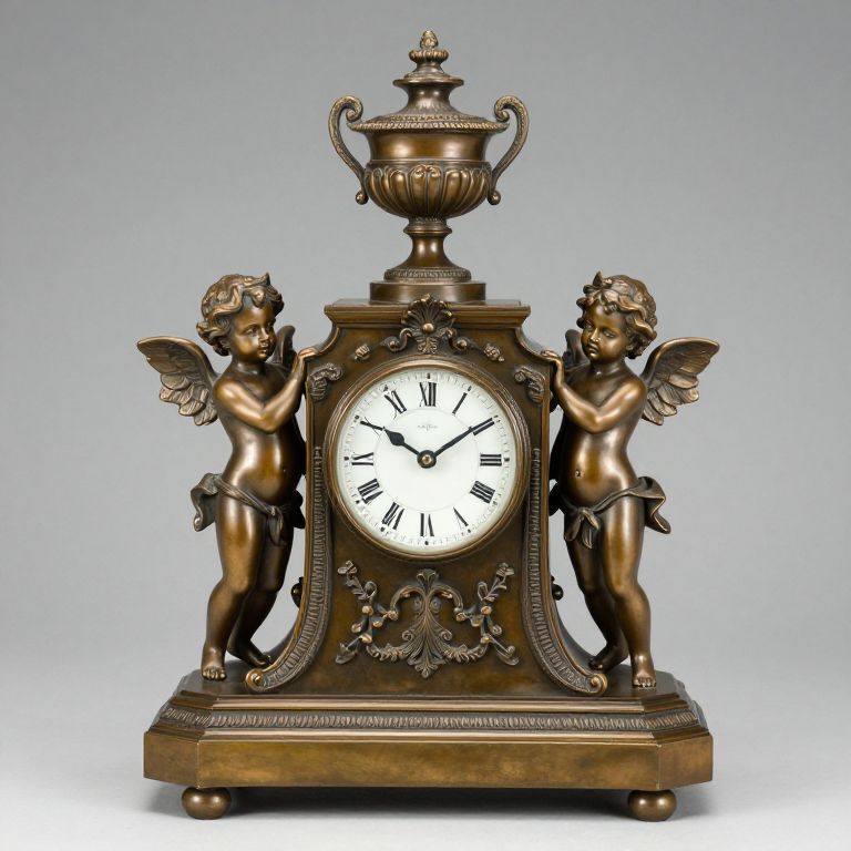 Photograph of an antique, bronze-colored clock with an ornate design. The clock features two cherubic, winged figures on either side, each holding the sides of the clock's frame. The central face displays black Roman numerals on a white background, with black hands indicating the time. The top of the clock has a decorative urn-like structure with two curved handles. The base and frame are detailed with intricate floral and scrollwork patterns. The background is a solid, gradient gray, highlighting the clock's elegant and classical design.