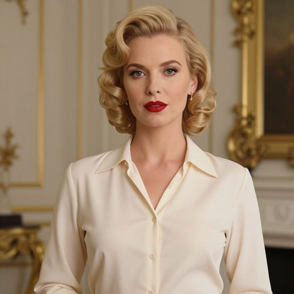 Photograph of a fair-skinned woman with blonde, curled hair, wearing a white, button-up blouse and black skirt. She has red lipstick, subtle makeup, and a confident expression. The background features an elegant, ornate room with gold accents, white walls, and a blurred candelabrum. The lighting is soft, highlighting her face and blouse. The overall style is classic and sophisticated, reminiscent of mid-20th century fashion.