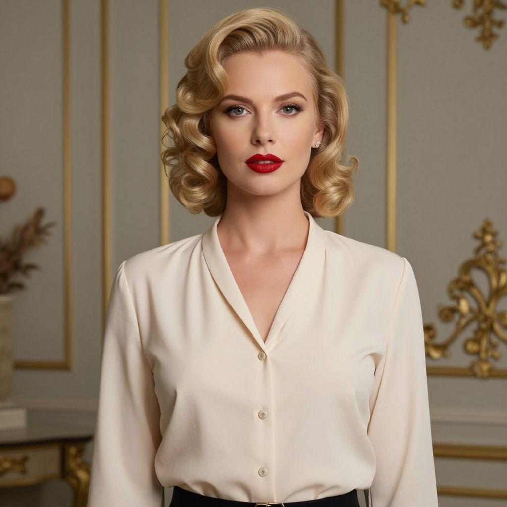 Elegantly styled blonde woman with voluminous curls and bold red lipstick stands confidently in a cream blouse, exuding timeless grace against a backdrop of soft lighting and classic decor.