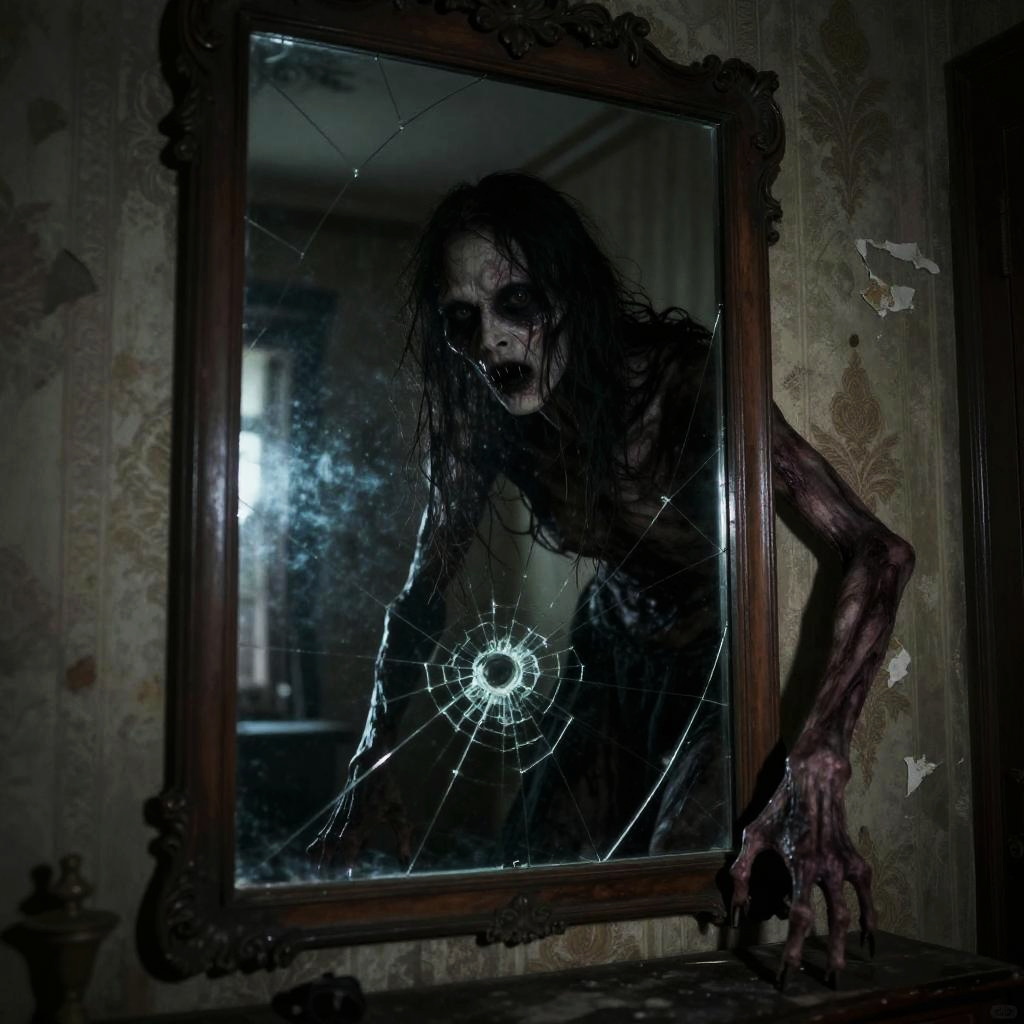 Creepypastas atmosphere, a terrifying humanoid figure with unnaturally long limbs and distorted features lurking behind a cracked mirror in an old decrepit room, peeling wallpaper, eerie reflections, and a faint sinister glow illuminating the haunted space.