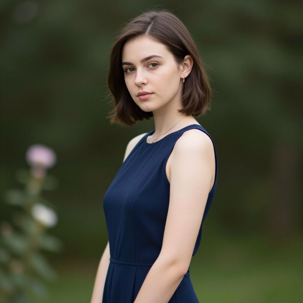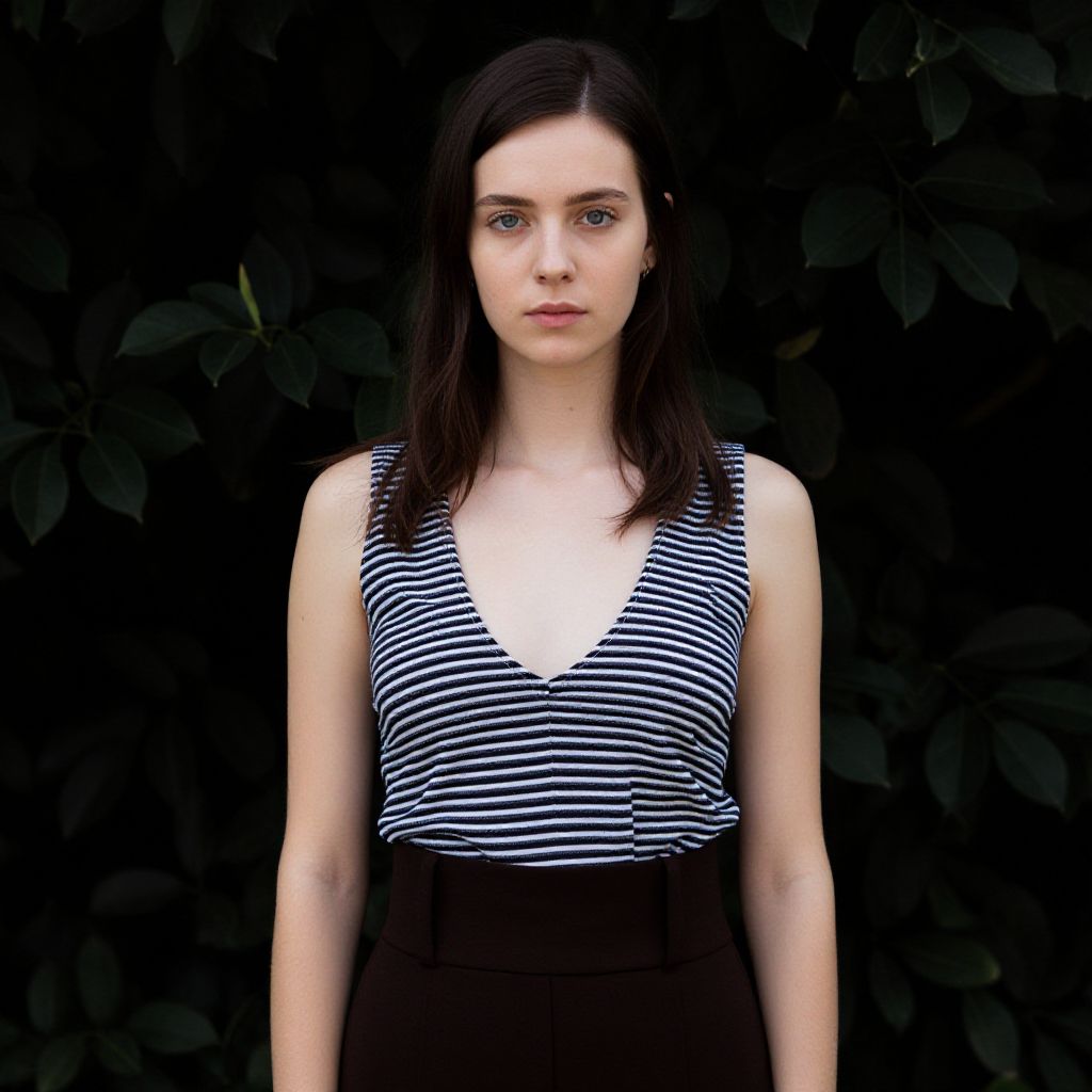 Photograph of a young woman standing against a dark, leafy background. She has straight, dark brown hair, fair skin, and blue eyes. She's wearing a sleeveless, black-and-white striped top with a deep V-neck, paired with high-waisted, dark brown pants. Her expression is neutral, and she looks directly at the camera. The lighting is natural, highlighting her features and the texture of the leaves behind her.