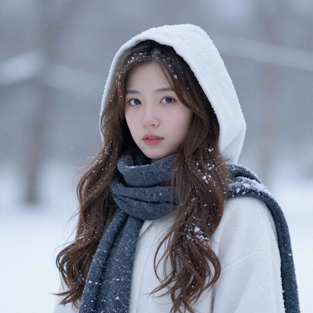 Photograph of an Asian woman with long, wavy brown hair, wearing a white, hooded winter coat and a thick, dark gray scarf. Her coat is dusted with snowflakes, and she has a slightly serious expression on her face. The background is a blurred, snowy outdoor setting with bare trees. The image has a soft, cool color palette dominated by whites and grays, with the woman's fair skin contrasting against the snowy backdrop. Her eyes are softly focused on the camera, and her lips are a natural pink.