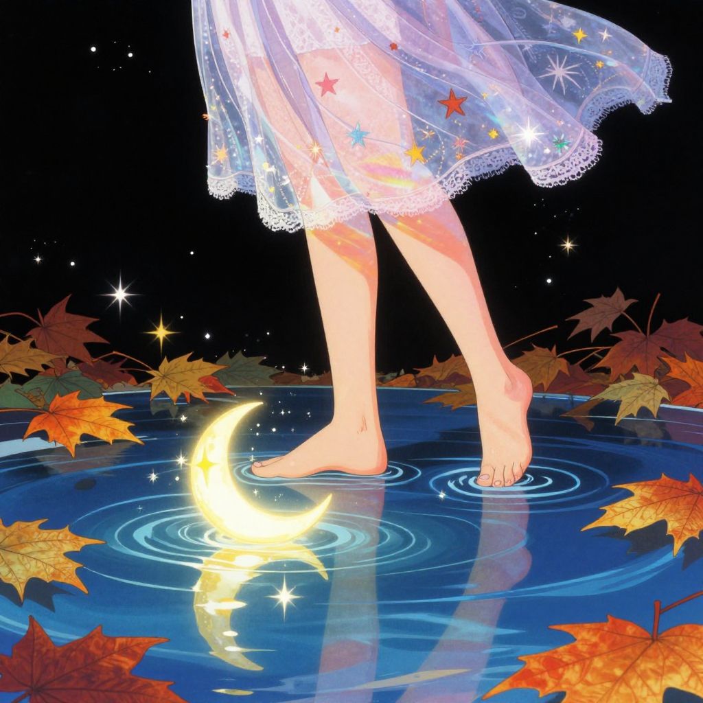 Weibo, drawing, illustration retro 90's, yoji shinkawa, James Jean, Ayami Kojima, futuristic, anime-inspired look, A serene and dreamlike scene captured from a low and tilted angle, focusing on the lower legs and bare feet of a sexy 57 year old woman standing delicately in a shallow pool of water, The perspective emphasizes the reflection of a magical crescent moon surrounded by radiant golden stars shimmering on the water's surface, Scattered throughout the pool are vibrant autumn leaves, adding warmth to the ethereal scene, The girl's lace-adorned dress with embroidered stars flows gracefully, complementing the celestial elements, The rich blues of the water, glowing gold reflections, and fiery autumn tones create a mystical atmosphere, enhanced by the dynamic composition of the tilted viewpoint, The lighting is vibrant and colorful, casting reflections that create a prismatic, digital glitch effect around her legs and dress, giving her an ethereal, otherworldly appearance, dreamlike quality, animestyle, pastelcolors, glowing, lowangleperspective, tiltedangle, barefeet, crescentmoon, glowingstars, serenewater, autumnleaves, lacedress, embroideredstars, celestialreflection, magicalglow, holoraphiceffect, digitalglitch, prismaticlighting, neonglow, blackbackground, etherealaesthetic, side view, dreamlikequality, futuristicanime