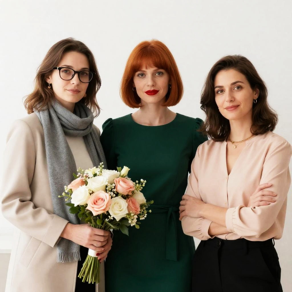 Photograph of three women standing closely together. Left woman wears glasses, beige coat, gray scarf, holding floral bouquet. Middle woman with short red hair, green dress, red lipstick. Right woman with brown hair, peach blouse, necklace, arms crossed. White background.