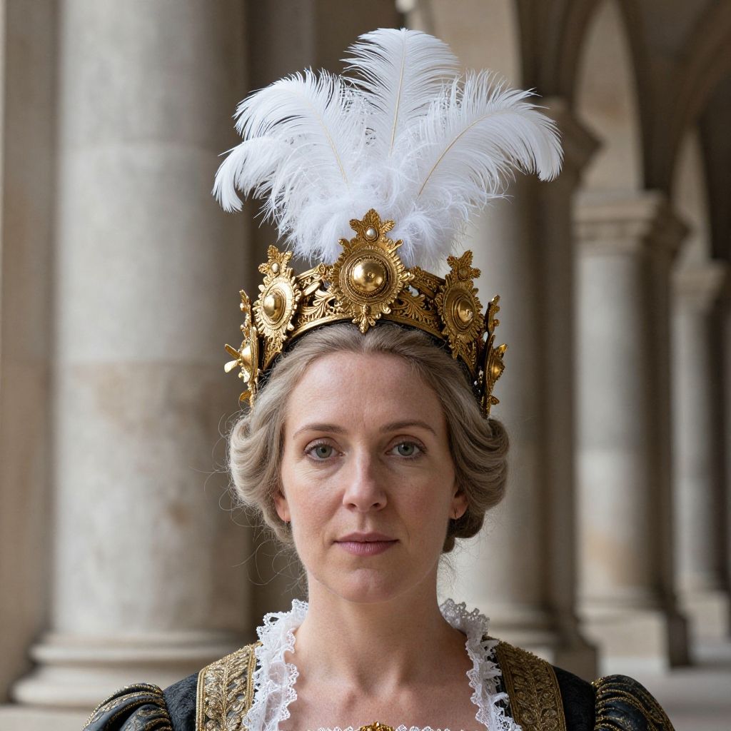 A woman dons an elaborate headpiece reminiscent of a Flemish Baroque style, featuring intricate golden elements and white feathers, set against the backdrop of a columned structure suggestive of a historic location.