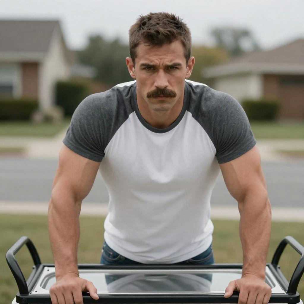 Photograph of a muscular man with short brown hair and a mustache, wearing a white and gray raglan shirt, leaning on a black ice cream cart. Blurred suburban background. Hands resting on cart, intense gaze. Single person.