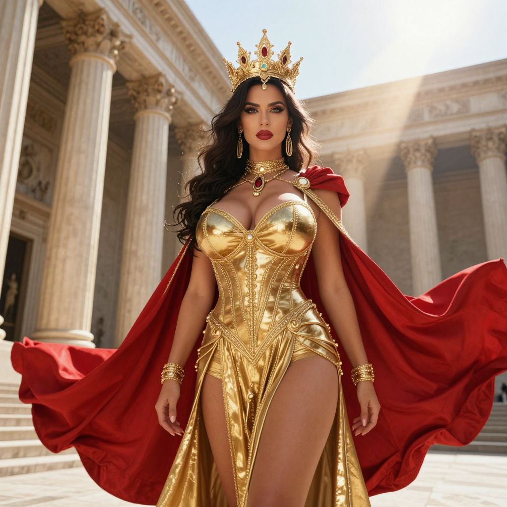 Photograph of a regal woman standing in a grand, classical-style building with tall, ornate columns. She has long, wavy black hair and wears a gold crown adorned with jewels. Her outfit is a shimmering, gold, strapless gown with high slits, revealing her toned legs, and a flowing red cape draped over her shoulders. She has large gold earrings, a matching necklace, and a confident expression with red lipstick. The sunlight creates a glowing effect around her. The background shows a sunlit, marble courtyard with large columns and a bright, open sky. The image has a CGI-enhanced, hyper-realistic style.