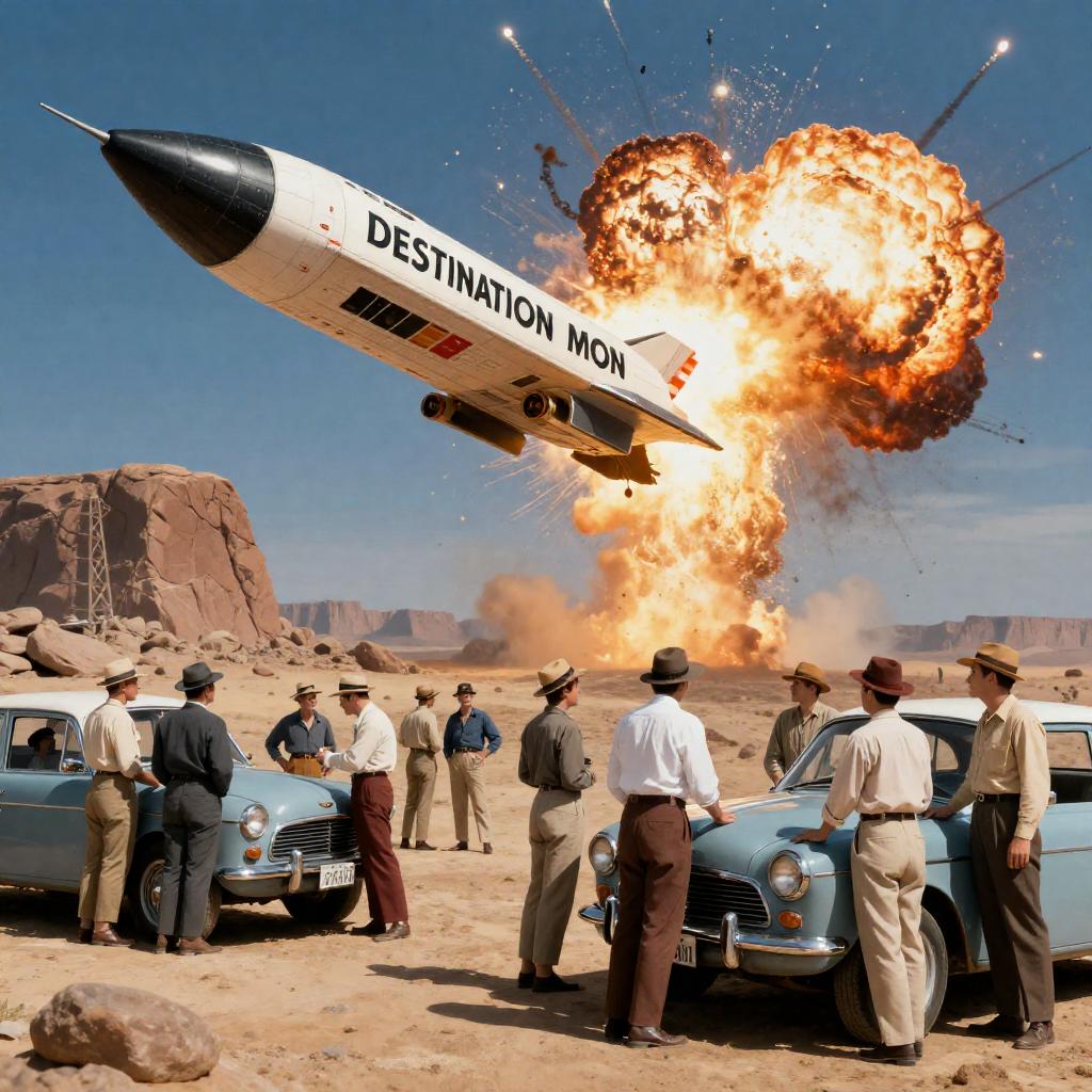 Movie poster for "Destination Moon." Colorful illustration of a rocky desert landscape with a spaceship in the sky. Multiple people in 1950s-style clothing, including hats and suits, gather around vehicles. Bright sunlight. Intense spaceship explosion in the sky.