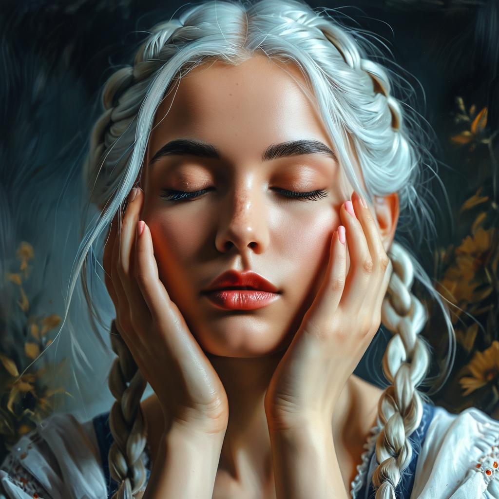Photorealistic digital portrait of a fair-skinned, silver-haired woman with braids, closed eyes, and red lips, hands gently touching her face
