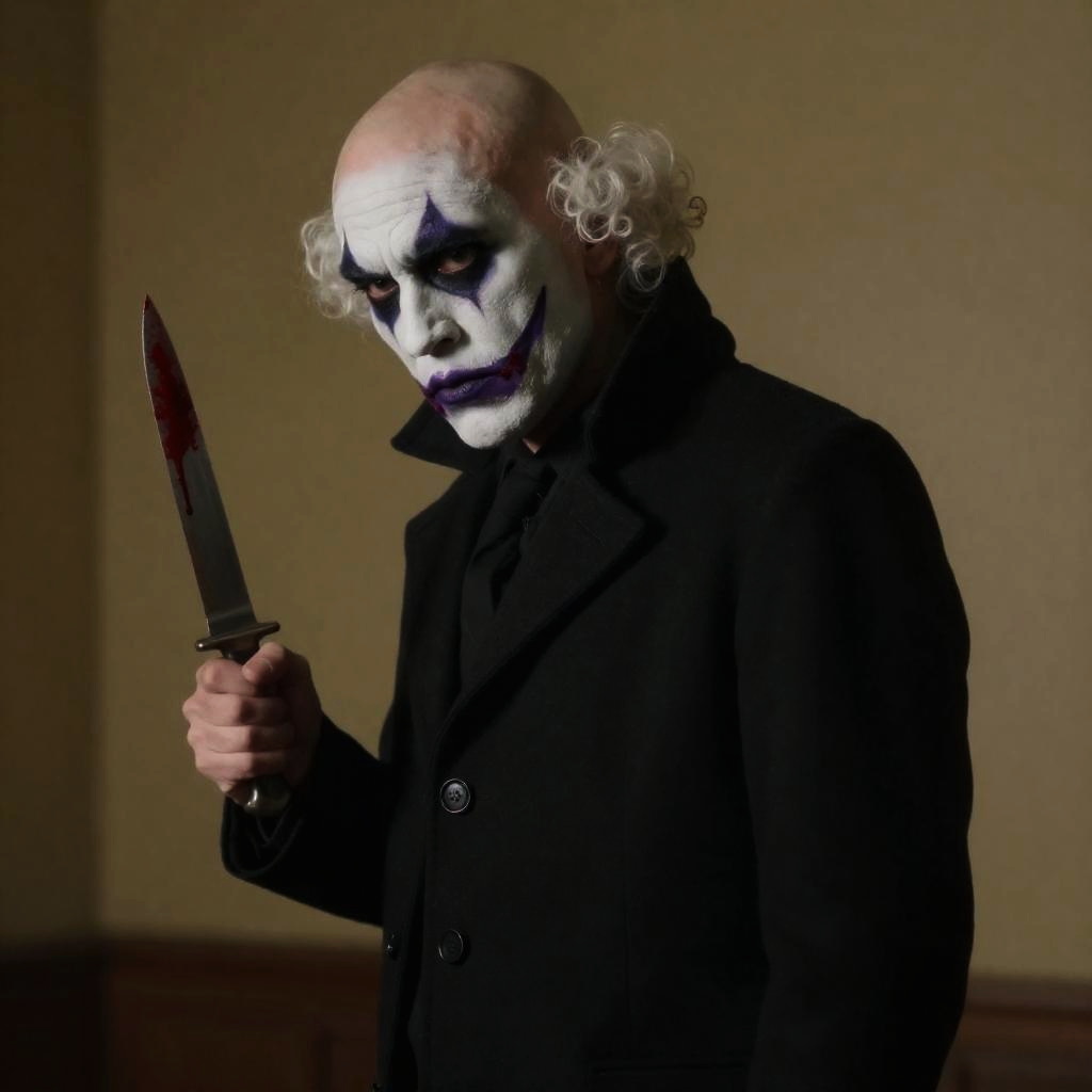Photograph of a bald man with white, curly hair, wearing a black coat, painted white and purple facial makeup with a grotesque, skeletal mask-like expression. He holds a blood-stained knife in his right hand. Dim, yellow-lit background.