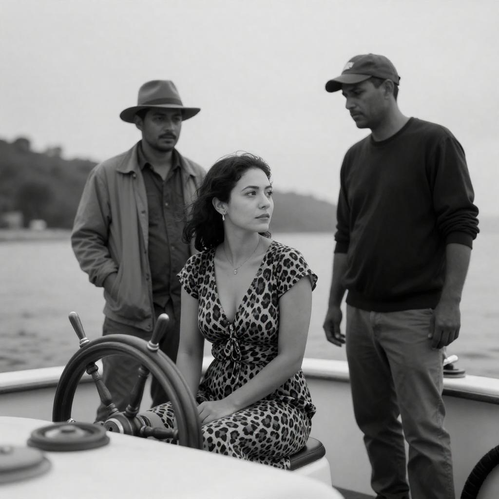 Black-and-white photograph featuring a young woman in a leopard-print dress sitting at the helm of a boat, flanked by two men. One man wears a wide-brimmed hat, jacket, and buttoned shirt, standing behind her, while the other man, dressed in a dark long-sleeve shirt and cap, stands to her right. The background shows a blurred hilly shoreline and water, emphasizing the nautical setting.
