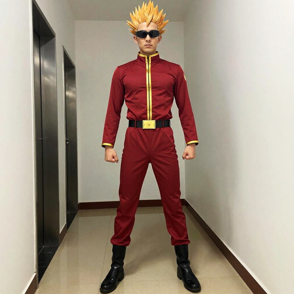 One Punch Man Saitama Costume, man in a red and gold outfit standing in a hallway