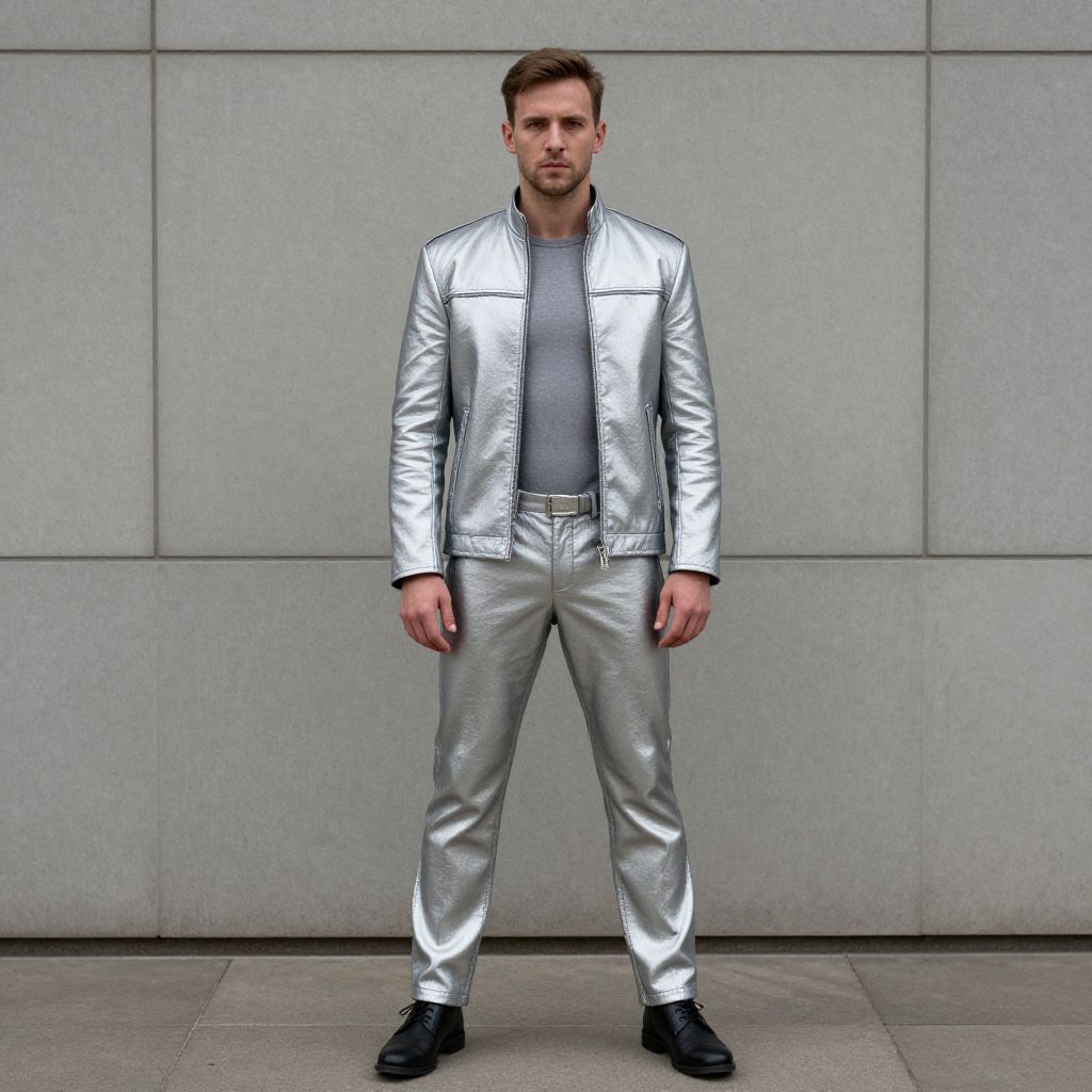 Photograph of a Caucasian man with short, light brown hair and a trimmed beard, standing against a gray, paneled wall. He wears a shiny, metallic silver jacket and matching pants, over a gray t-shirt, with a silver belt and black leather shoes. His stance is confident, with arms slightly relaxed at his sides. The outfit has a futuristic, avant-garde style, contrasting with the minimalist background. The lighting is even, highlighting the reflective quality of the silver fabric.