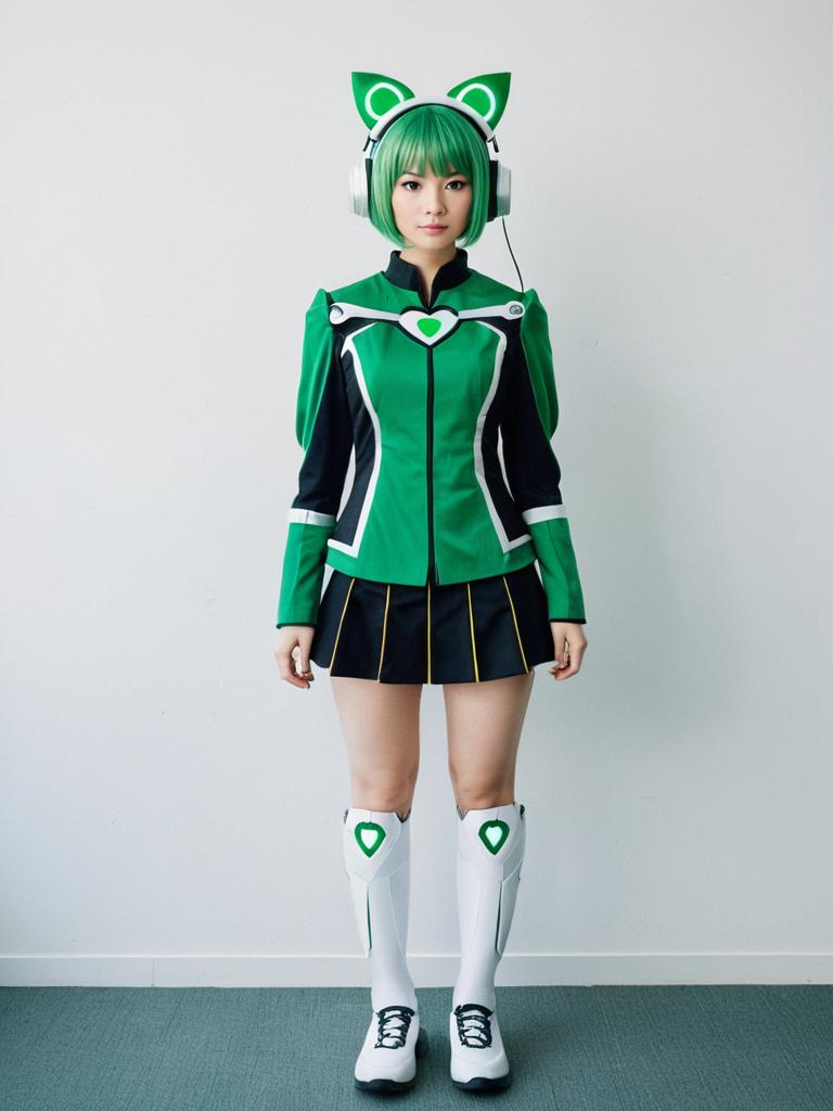 Photo-realistic cosplay photo of person in multi (to heart) costume. Full body. Standing. Full length. 1girl, robot ears, green eyes, short hair, green hair, serafuku, serafuku, long sleeves, android