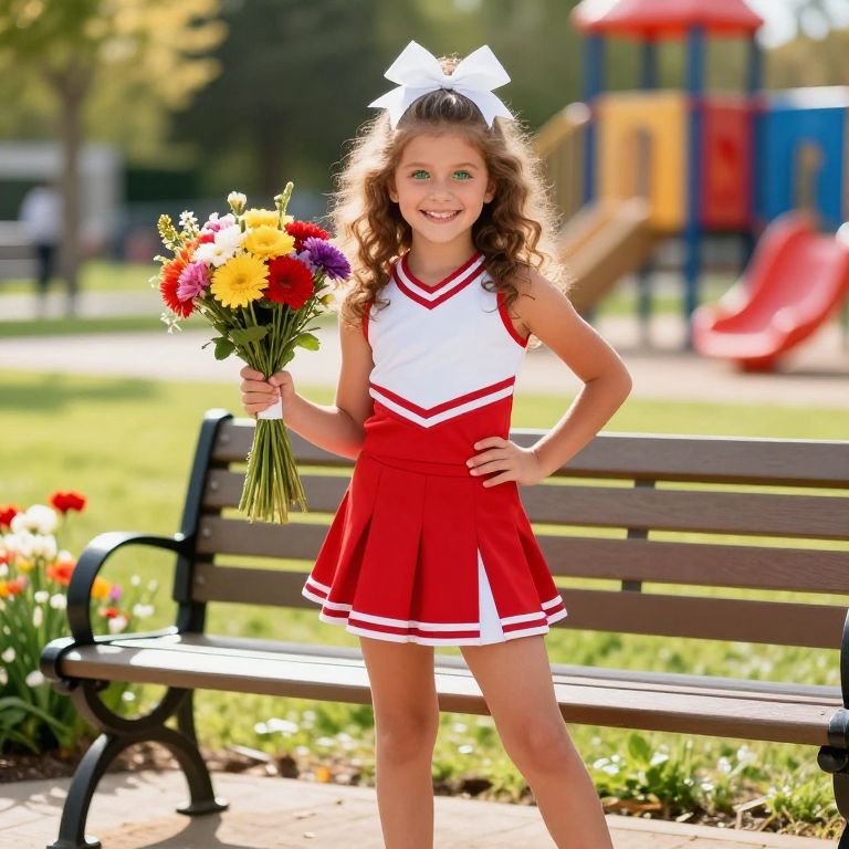 A young girl with bright, curly brown hair and sparkling green eyes is wearing a red and white cheerleader outfit with a white bow on her head. She is holding a vibrant bouquet of fresh flowers in her right hand, the petals glowing softly in the sunlight. She stands confidently on a sunny park bench, smiling with a joyful expression, her feet slightly apart as if ready to lead the crowd in a cheer. The background features a colorful outdoor setting with a playground in the distance and blooming flowers in the foreground, adding a lively and cheerful atmosphere.