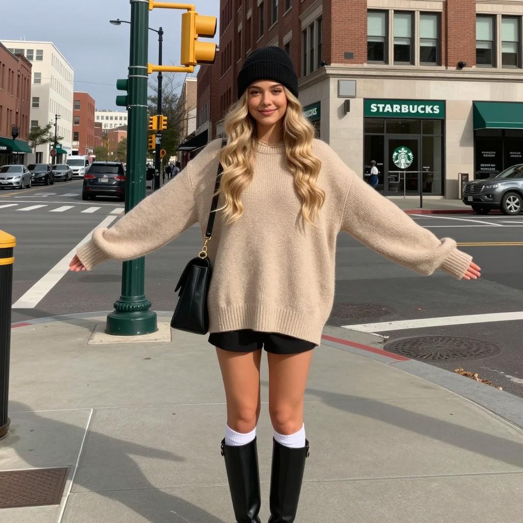 Young woman with long wavy blonde hair, black beanie, oversized beige sweater, black shorts, white socks, and black knee-high boots. She stands on a city sidewalk, arms outstretched, smiling. Background: Starbucks Coffee, street, buildings, traffic light, lamppost.