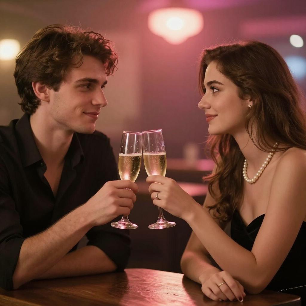 A portrait of man and a woman sharing a laugh in front of a coffee shop in a New York City bourogh, inkpunkHeavy768, f/1.4, square image, close up film photo, portrait of a Young Man, red tight curled, dark brown eyes, high fashion jewelry, elegant pose, atmospheric lighting, cinematic composition, detailed, summer, filmgenre__