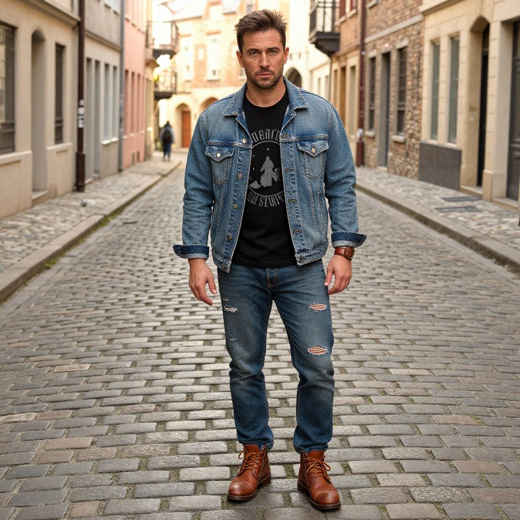 Photograph of a bearded man in a blue denim jacket, black graphic tee, ripped jeans, brown boots, standing on a cobblestone alley
