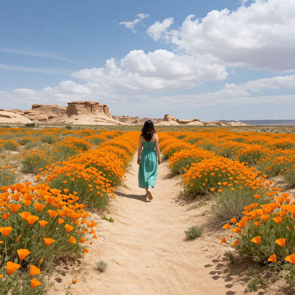 Photograph of a woman in a turquoise dress walking through a vibrant orange wildflower field, leading to sandy desert cliffs under a bright, partly cloudy sky