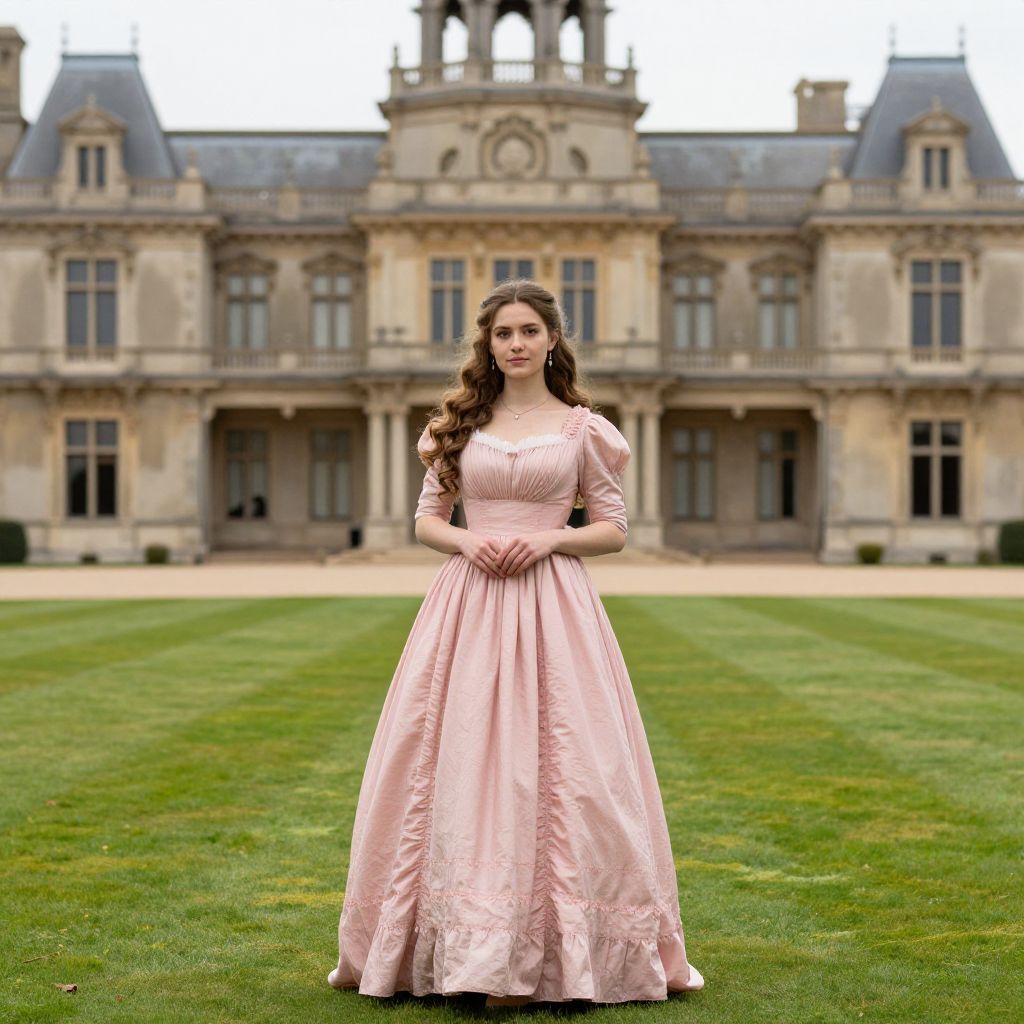 Elegant young woman in a Victorian-style pink dress stands gracefully in front of a grand manor house, her flowing curls complementing the lush green lawn and ornate architecture behind her.