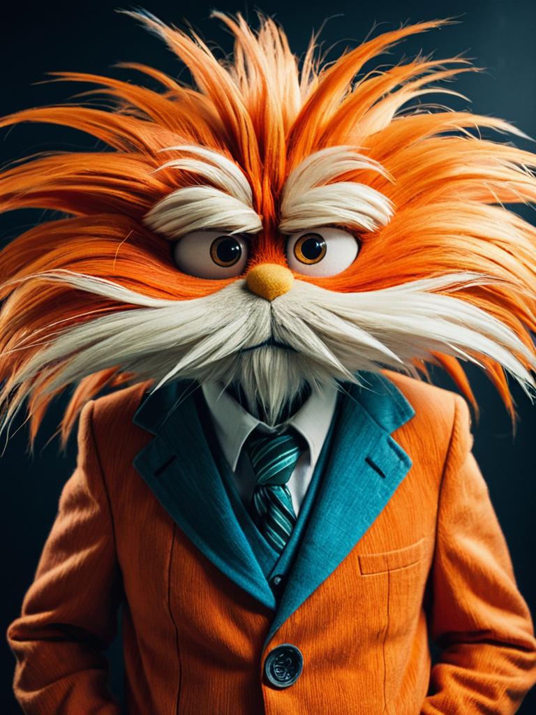 Man in Lorax Costume, photorealistic studio cosplay photo, sharp detail
