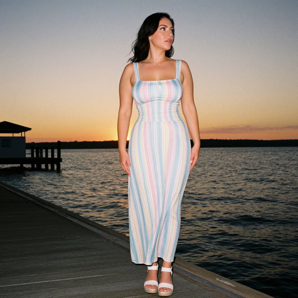 A curvy woman in a pastel striped sundress with a square neckline and thin straps stands at a fishing pier, enjoying the sunset. She wears white espadrille wedges and has simple makeup with minimal jewelry. The scene is captured in a vibrant technicolor analog film style, highlighting the warm hues of the evening sky as she gazes out at the water, savoring the moment. Sexy. Pretty face and beаutiful eyes. Big breasts