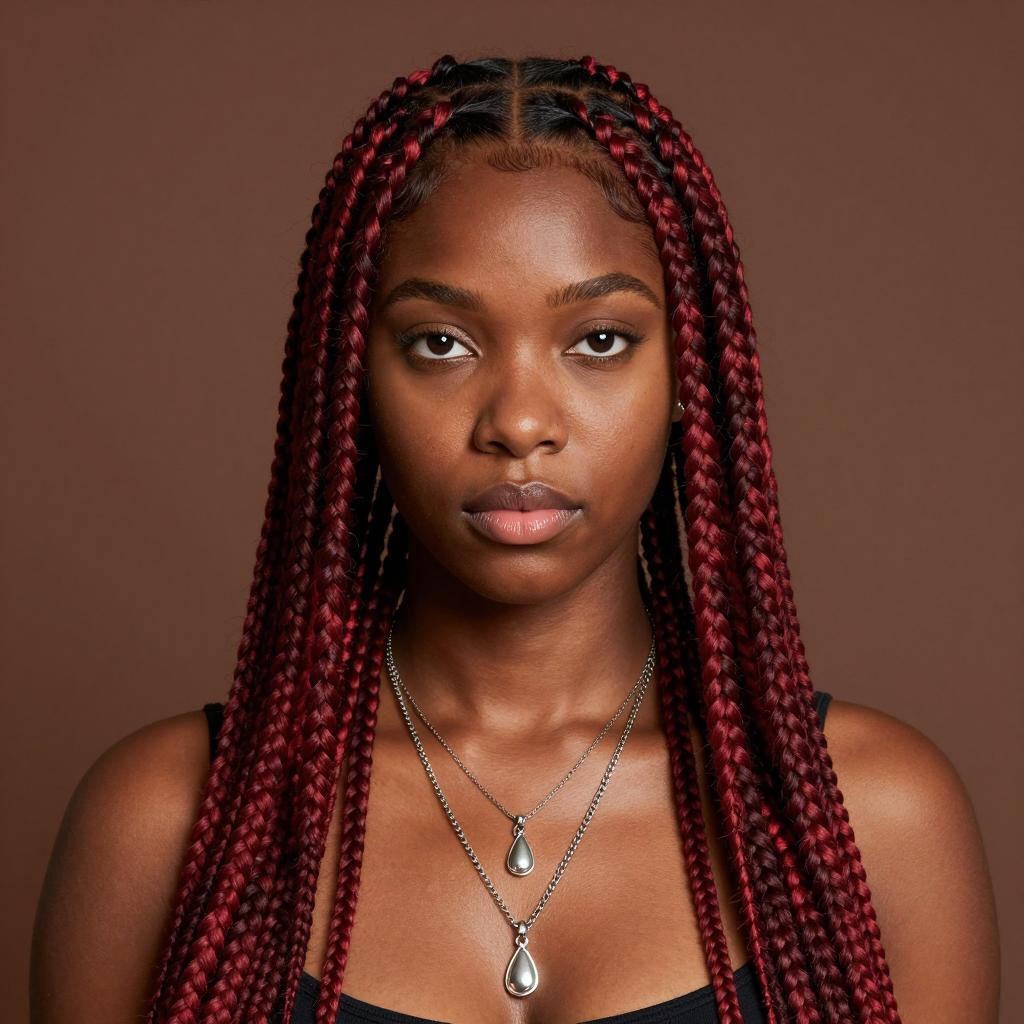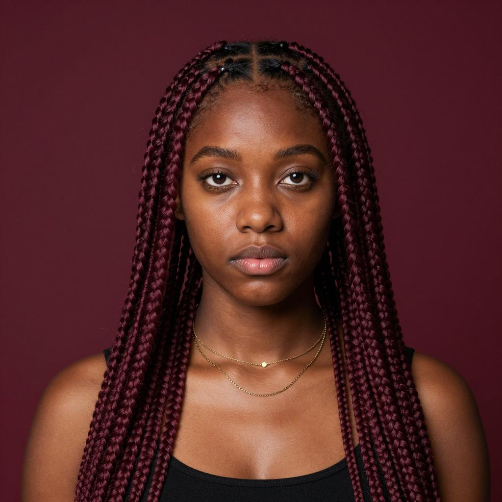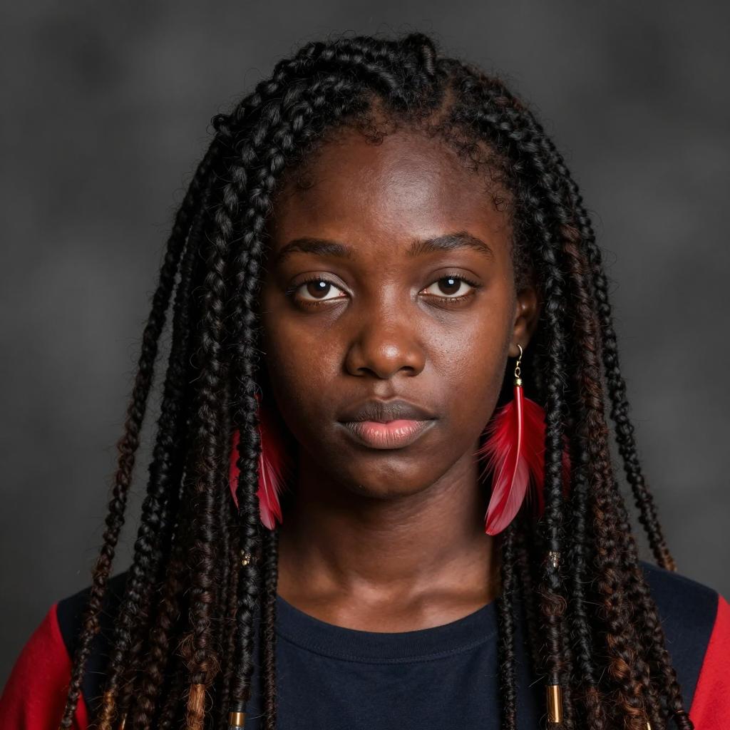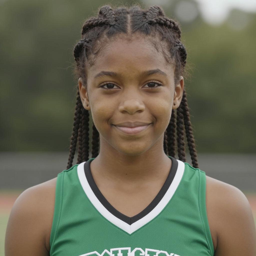 Green cheerleading costume, photograph of a young black girl, medium brown skin, dark brown braided hair in two ponytails, wearing a green athletic sleeveless top with white and black stripes, smiling softly, bright natural light, outdoor setting with blurred green trees in background, centered in frame, close-up, daytime, realistic, vibrant colors, focused on face, casual style, confident expression
