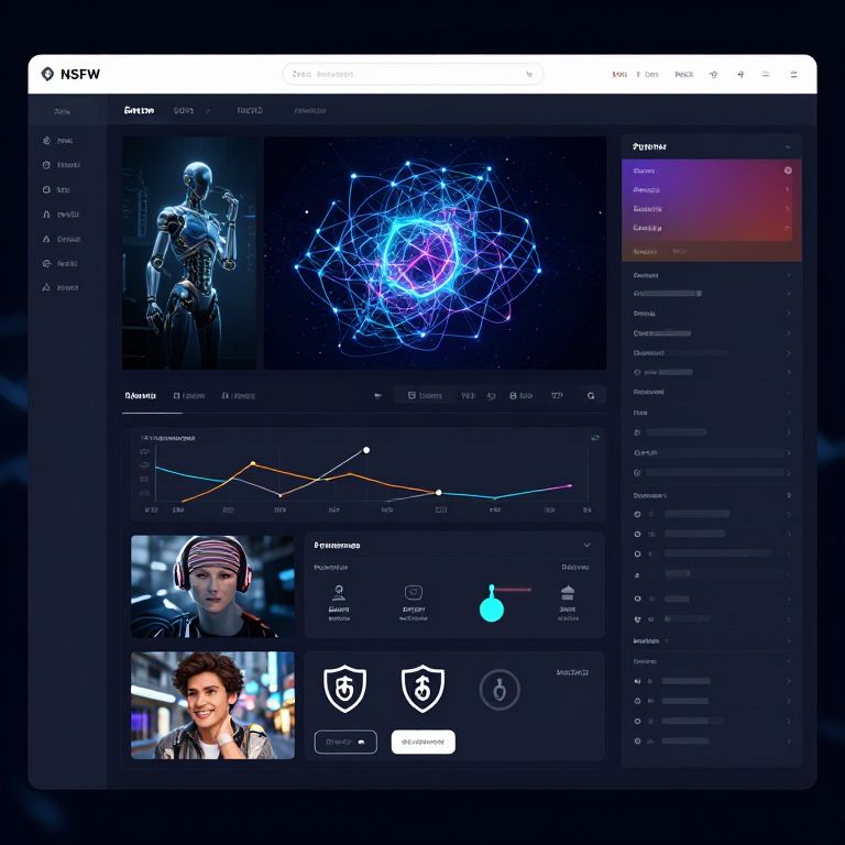 High-tech NSFW AI photo editor dashboard with multiple photo editing layers, AI enhancement graphs, glowing neural network patterns, cybernetic atmosphere, dark theme with colorful accents, clean and professional, displaying privacy protection icons prominently.