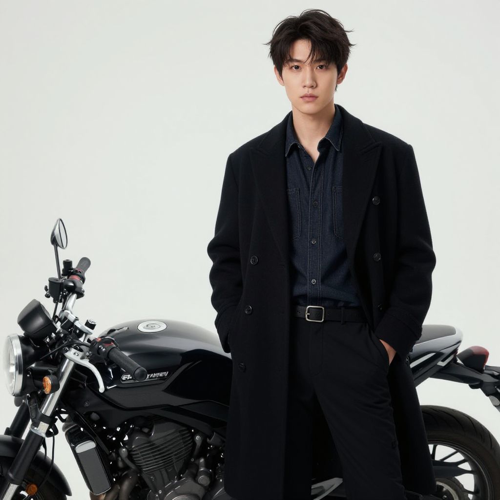 Photograph of a young Asian man with short, slightly messy black hair, standing confidently in front of a black Yamaha motorcycle. He wears a long, black overcoat over a black, button-up shirt with subtle vertical stripes, and black pants with a belt. His hands are casually tucked into his coat pockets. The motorcycle, positioned to his left, has chrome accents and a visible Yamaha logo on the fuel tank. The background is pure white, making the dark colors of his outfit and the motorcycle stand out prominently. The man's expression is serious and composed.