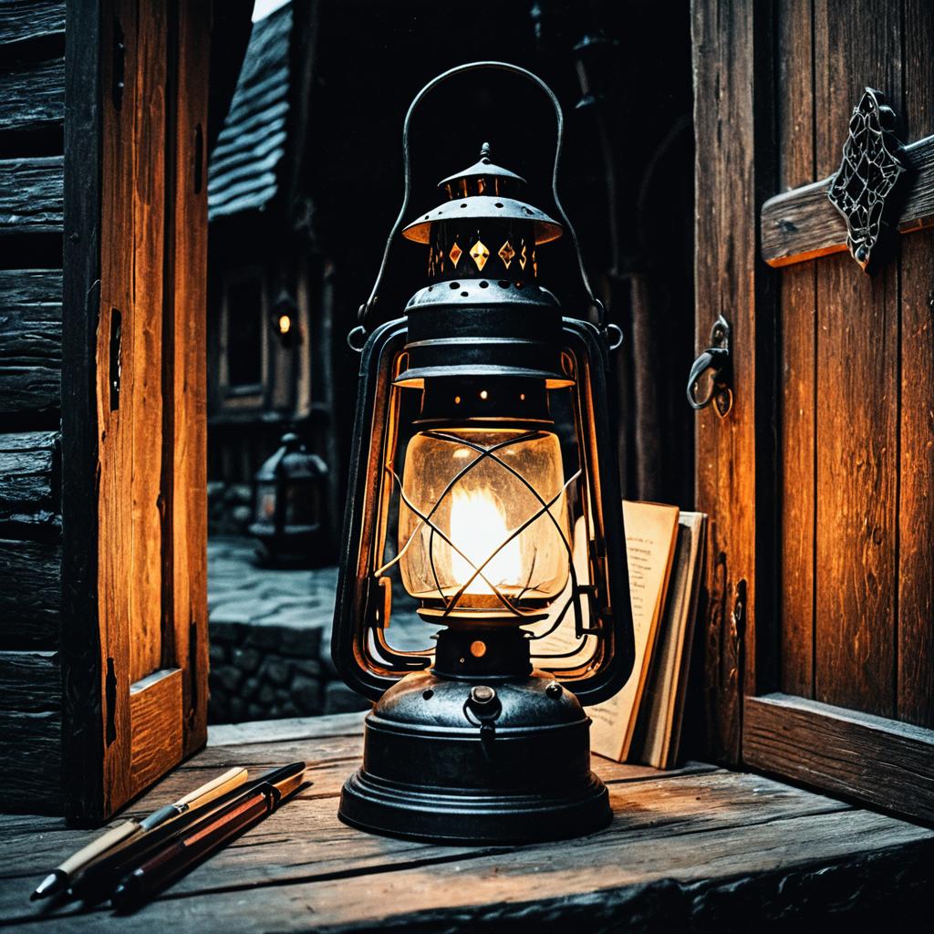 A rustic medieval-style lantern glowing warmly on a textured wooden table next to a stack of vintage books and a classic gold and black fountain pen. The scene is set in a dimly lit room with wooden paneled walls and a window revealing a warm firelight outside, evoking a historical, old-world atmosphere.