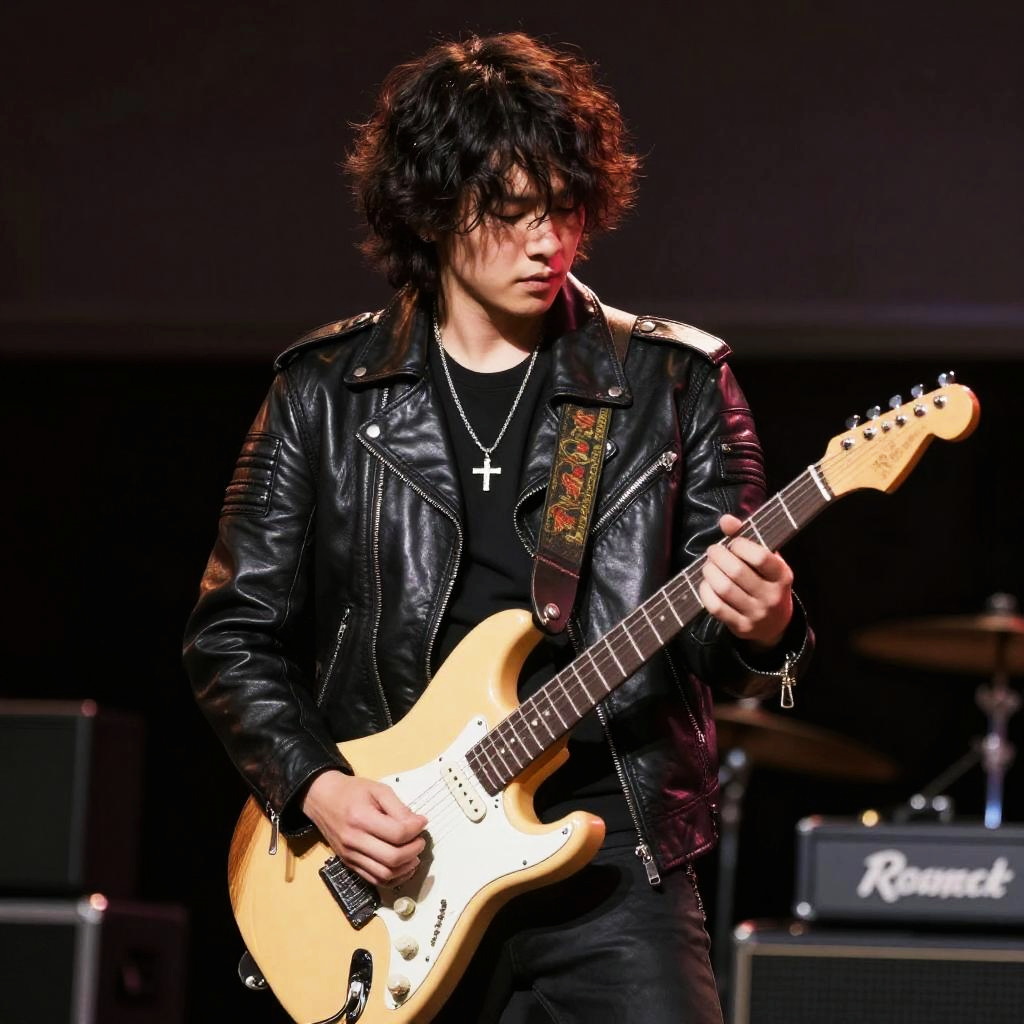 Rock Band, with a guitar and a leather jacket on a stage