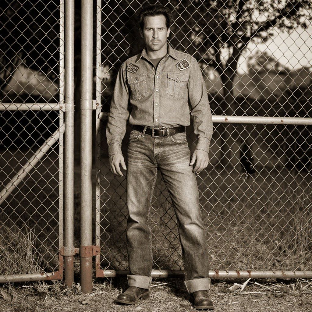 Sepia-toned photograph of a Caucasian man with short dark hair, standing in front of a chain-link fence. He is wearing a long-sleeved, button-up, denim shirt with patches on the chest, and matching denim jeans with a black belt. He stands with his hands by his sides, wearing brown boots. The fence behind him has a metal gate and is slightly rusted. The background shows blurry trees and grass. The man's expression is neutral, and the overall texture is gritty, evoking a rustic, outdoor setting.