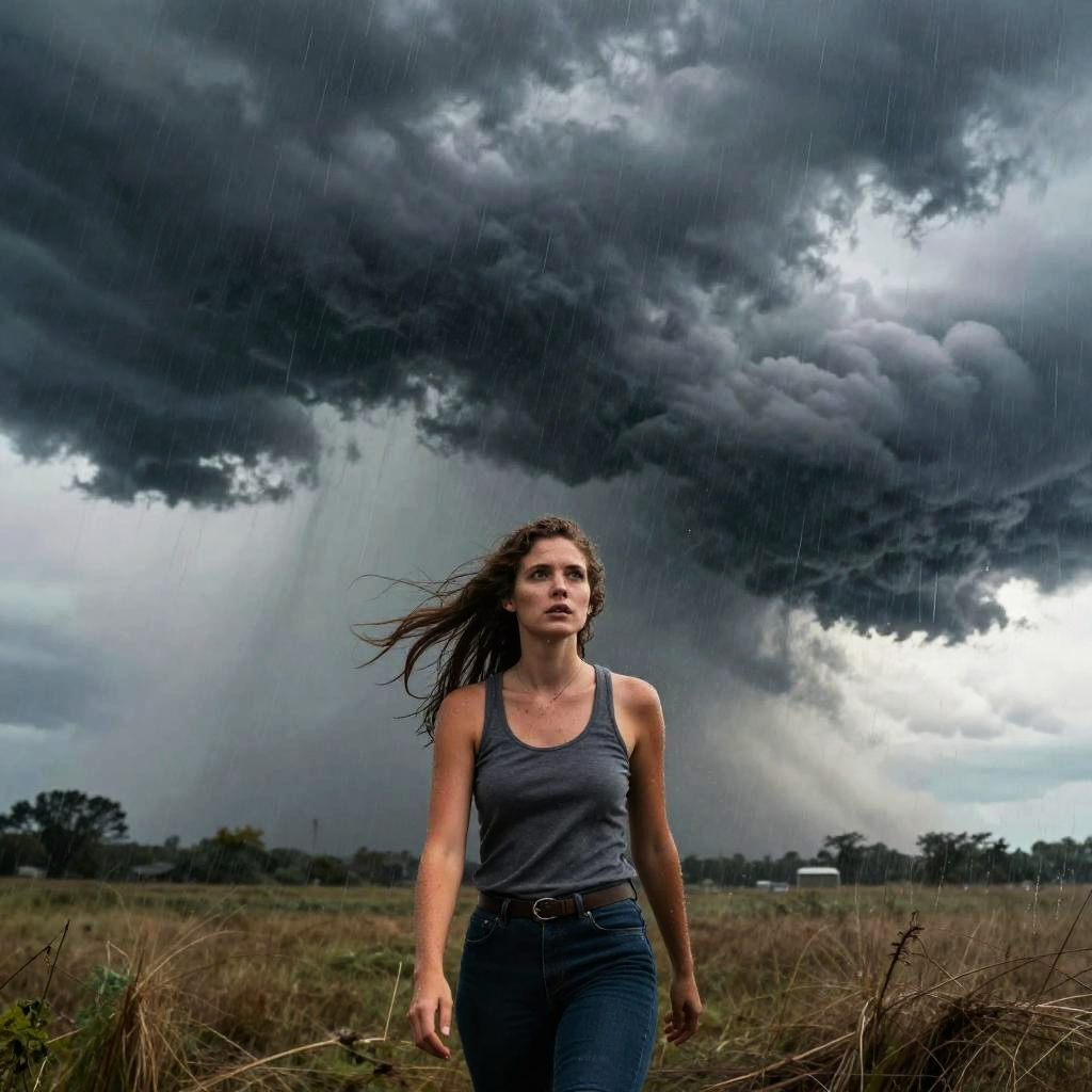 Epic scene featuring Laura Rowe amidst a massive supercell storm, dark cumulonimbus clouds spinning overhead, fierce wind and rain swirling around her, photorealistic style with sharp contrasts and dramatic storm energy conveying intensity and resilience.