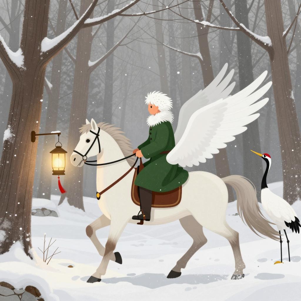 Illustration of a snowy forest with a person riding a white, winged horse. The rider, with white fur around their head and neck, wears a green coat and holds a glowing lantern in their right hand. Red cranes are attached to the rider's back. Snow is falling, and trees are tall and barren. The rider's face is not visible. The lantern is on the left, hanging from a red tassel. Snow covers the ground and trees. The rider is slightly turned to the right, mid-gallop. The horse's wings are partially extended.