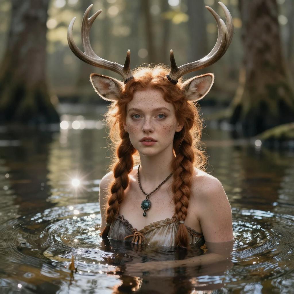(masterpiece, best quality), 1girl, ginger hair, deer antlers, dress, in water, looking at viewer, swamp, hair ornament, necklace, lens flare, reflective water, freckles, braid