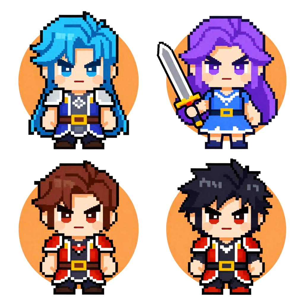 This digital pixel art image features four chibi-style characters, each with distinct colors and outfits, set against orange circular backgrounds. Top left: a blue-haired character with blue eyes, wearing a blue and white outfit with a black belt. Top right: a purple-haired character with purple eyes, holding a sword, dressed in a blue dress with white trim. Bottom left: a brown-haired character with brown eyes, wearing a red and black outfit with a white shirt and black pants. Bottom right: a black-haired character with red eyes, dressed in a black and red outfit with a white shirt and black pants. Each character has a small, determined expression.