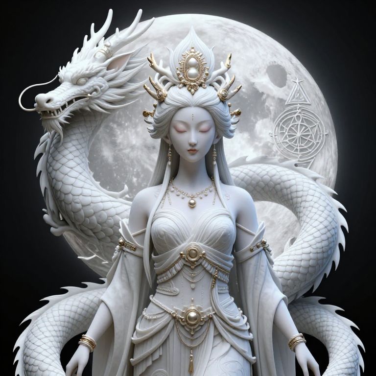 A digital CGI artwork features a serene, pale-skinned, white-haired woman with closed eyes, wearing an ornate, white, off-shoulder dress adorned with gold jewelry and intricate patterns. She stands in front of a luminous, full moon with a detailed, white dragon coiled behind her. The dragon's scales and flowing mane add texture and depth. The woman's dress has long, flowing sleeves, and she wears a gold crown with a sun-like emblem. A mystical, geometric symbol floats near the moon. The background is a stark black, emphasizing the ethereal, celestial theme. The overall style is fantasy realism.